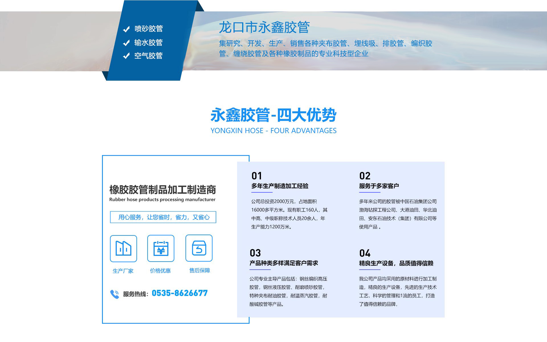 龍口市永鑫膠管有限公司始建于1979年。位于山東半島北端——龍口市,毗鄰龍口港、威烏高速公路和大萊龍鐵路,商業運輸,交通方便,地理位置好。公司總投資2000萬元,占地面積16000多平方米。現有職工160人,其中高、中級職稱技術人員20余人,年生產能力1200萬米。多年來公司的膠管被中國石油集團公司渤海鉆探工程公司、大港油田、華北油田、安東石油技術(集團)有限公司等使用產品我公司迎著十八界三中全會的改革大潮始終闊步向前,目前我公司主要從事高低壓橡膠軟管、鉆探膠管、夾布膠管、噴砂膠管、橡膠管帶制品,等產品的生產和研發(fā),主導產品包括:生產,研制高低壓橡膠軟管、輸送皮帶等以橡塑為主的產品,擁有各類進口,國產生產設備120多臺套,化驗,分析,試驗儀器設備種類多,檢測手段完善。我公司產品均采用的原材料進行加工制造,精良的生產設備和穩(wěn)定技術工藝,科學的管理,打造了客戶信任的牌子,先后與多家石油、化工、汽車制造等大型國有企...